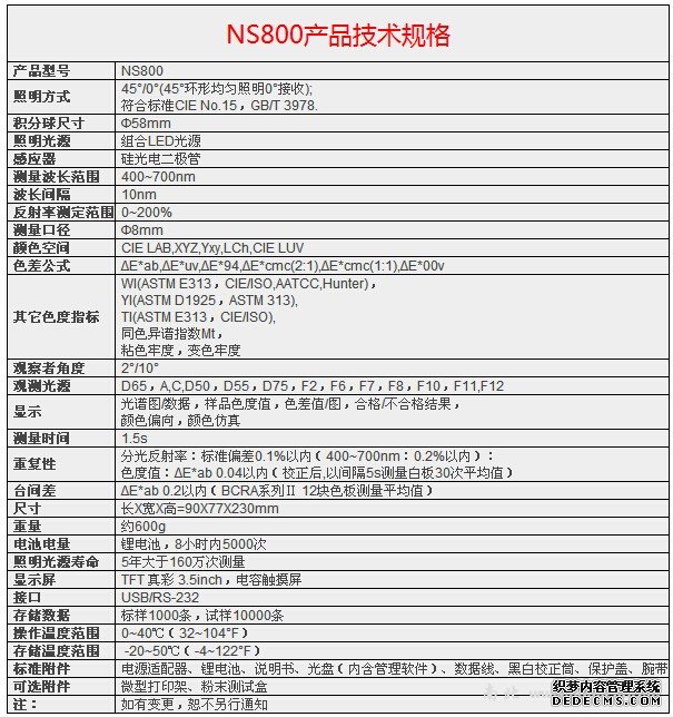 NS分光測色儀采用了組合LED精密分光的原理,將光 線按一定波長間隔分開,然后采用若干組傳感器陣列進(jìn)行感光分析。NS分光測色儀的精度更高,對任何顏色都非常敏感,除了準(zhǔn)確測量Lab值、dE值之 外,還可以直接顯示光譜反射率曲線,可以實現(xiàn)配色功能,也可以計算出各種色差儀公式的真正參數(shù)。